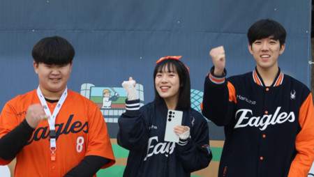 [충청투데이 나예원 기자] 한화이글스의 플레이오프 3차전이 열린 21일 저녁, 대전 국립중앙과학관 앞마당은 또 하나의 ‘작은 볼파크’로 변했다.대형 스크린으로 중계된 경기 속에 팬들의 함성이 겹치며 주황빛 물결이 일렁였다.이 열기 한가운데, 자원봉사로 응원단장을 맡은 팬 세 명이 있었다.15년차 팬인 송혁준(23·대전 관저동)씨는 이곳에서 음향담당을 자처했다.그는 “직관 다니는 걸 정말 좋아하는데 이번엔 원정 응원을 못 가서 아쉬웠어요. 지난번 기흥전 때도 과학관에서 봤는데, 그땐 응원단이 없어서 허전하더라고요”“어릴 때부터 한화를