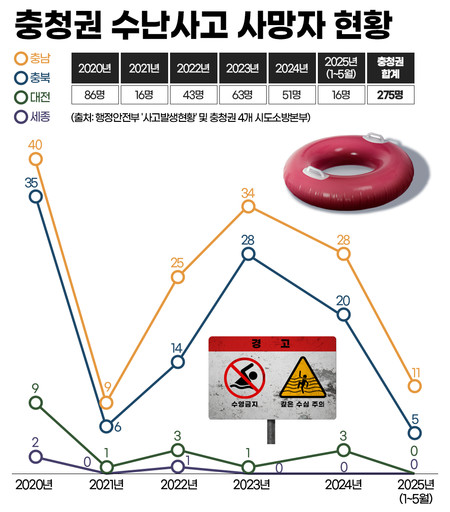 [충청투데이 김중곤 기자] 최근 기후변화 등 영향으로 여름철 집중호우가 거세지는 상황에서 충청권은 매년 50명 이상이 수난사고로 목숨을 잃고 있는 것으로 나타났다.더욱이 올해는 6월 강수량이 평년보다 많을 것으로 예측되는 만큼 집중호우에 대한 대비 수준에 따라 인명 피해 여부가 갈릴 것으로 전망된다.23일 행정안전부의 ‘사고발생현황’ 자료와 충청권 4개 시·도소방본부에 따르면 2020~2024년 관내에서 발생한 수난사고 사망자는 모두 259명으로 집계됐다.사망자는 장마철 집중호우가 특히 극심했던 2020년과 2023년에 각각 86명