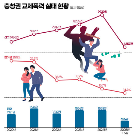 [충청투데이 김중곤 기자] 지난해 충청권에서 경찰에 신고된 교제폭력이 1만건에 육박하는 등 최근 4년 만에 2배 가까이 급증한 것으로 나타났다.하지만 피해자와 가해자의 관계가 긴밀하고 별도의 특별법이 없어 반의사불벌죄를 적용하는 범죄 특성상, 검거된 교제폭력 피의자 중 구속되는 비율은 1%에 불과한 실정이다.11일 경찰청에 따르면 지난해 충청권 4개 시·도에서 접수된 교제폭력 112신고는 9930건으로 집계됐다.충청권의 교제폭력 신고는 2020년 5186건부터 2021년 6512건, 2022년 7202건, 2023년 8235건, 지