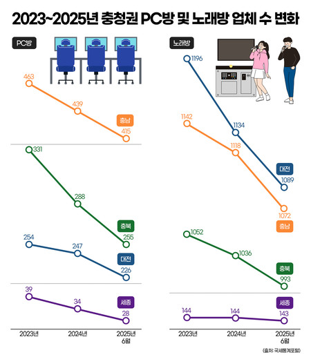 [충청투데이 최광현 기자] 한때 청춘의 상징이자 젊은 세대의 ‘놀이터’였던 PC방과 노래방이 쇠퇴의 길을 걷고 있다.2000년대 전성기를 누린 이들 업종은 집단에서 개인화로 변해가는 놀이문화와 디지털 일상화로 인해 MZ세대의 외면을 받고 있다.20일 국세통계포털에 따르면 올해 6월 기준 전국 PC방 개수는 6999개로, 2023년 대비 8421개에서 약 1422개(16.9%) 감소한 것으로 집계됐다.불과 3년 만에 PC방 5곳 중 1곳이 문을 닫은 셈이다.노래방 업계는 전년동기대비 2만7141개에서 2만5123개로 2018개(7.4