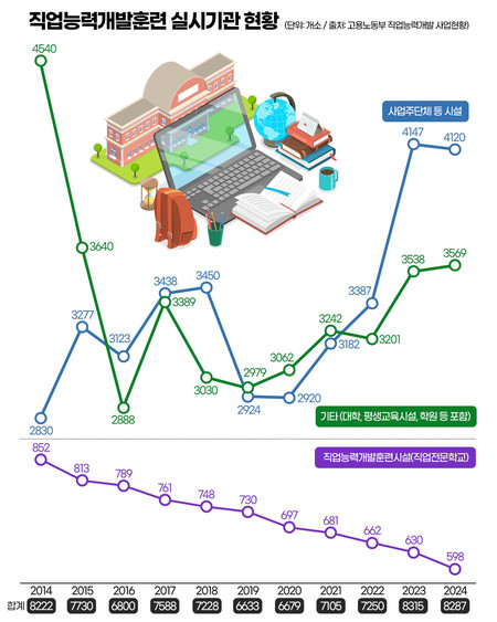 [충청투데이 김지현 기자] 직업훈련이 산업 변화와 고용 미스매치 해소의 핵심 수단으로 재조명되고 있는 가운데 정작 이를 담당해온 직업전문학교는 10년 사이 30% 가까이 급감했다.업계에선 규제 차별이 주요 원인으로 지목되며, 교육의 질 향상을 위한 직업훈련 제도 재설계가 필요하다는 지적이 나온다.10일 고용노동부 ‘직업능력개발 사업현황’ 자료를 살펴보면 민간훈련기관 지정직업훈련시설(직업전문학교)는 2014년 852개소에서 2024년 598개소로 감소했다.이는 10년만에 29.8% 감소한 수치다.반면 같은 기간 전체 민간훈련기관 수는