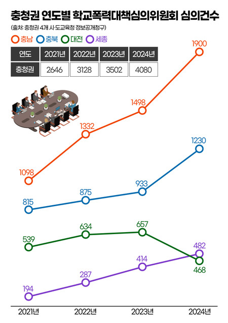 [충청투데이 서유빈·김중곤 기자] 지난해 충청권 교육청 내 학교폭력대책심의위원회(이하 학폭위)가 하루에 11번꼴로 열리는 등 교육현장이 분쟁으로 얼룩지고 있다.일각에서는 그동안 수면 아래에 있던 학교폭력 문제가 공론화되고 있다는 고무적인 시선도 있지만, 갈등 조정과 관계 회복이라는 교육적 가치가 퇴색되고 있다는 우려도 나온다.18일 충청권 4개 시·도교육청에 따르면 지난해 학폭위 심의 건수는 총 4080건이다.지역별로는 충남교육청이 1900건으로 가장 많았고 충북교육청은 1230건, 세종교육청 482건, 대전교육청 468건 등이 뒤