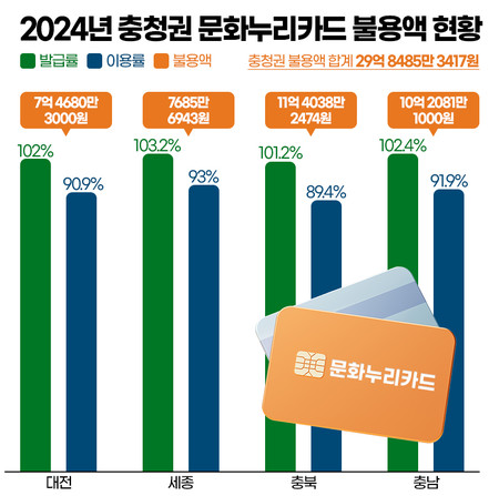 [충청투데이 김세영 기자] 통합문화이용권(문화누리카드) 충청권 예산이 매년 늘고 있지만 정작 수혜 고령층은 사용에 어려움을 겪는 실정이다.거동이 불편하거나 정책에 대한 인식이 부족해서인데, 발급률과 이용률 격차로 지난해 충청권에서만 불용액 약 30억원이 국고로 반납됐다.2일 대전·세종·충북·충남지역 각 문화재단 집계에 따르면 지난해 문화누리카드 예산은 약 345억원으로 대상자 27만 1131명에게 발급됐다.문화누리카드는 기초생활수급자와 차상위계층의 문화 향유를 돕기 위해 2006년 도입된 사업으로, 기획재정부 복권위원회의 복권기금으