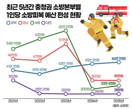 [충청투데이 김영정 기자] 대전·세종·충남 소방본부의 1인당 피복지원 예산이 전국 18개 본부 중 최하위권에 머물면서, 국민의 생명을 지키기 위해 최전선에서 싸우는 충청권 소방대원들의 기본 안전과 자존심마저 위협받고 있다는 지적이 제기됐다.국회 행정안전위원회 소속 한병도 의원(민주당, 전북 익산을)이 소방청으로부터 제출받은 자료에 따르면, 대전·세종·충남 소방본부 소방대원 1인당 피복지원 에산은 각각 28만 원, 32만 4000원, 35만 원으로 전국 18개 소방본부 평균 45만 원보다 크게 밑돌았다.전국 18개 소방본부에서 대전