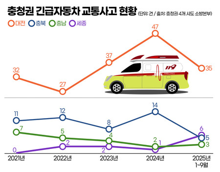 [충청투데이 김중곤 기자] 해마다 충청권에서 소방차, 구급차 교통사고가 50건 안팎으로 발생하고 있어 긴급자동차를 배려한 교통 문화 정착이 요구된다.22일 충청권 4개 시·도소방본부에 따르면 올해 관내에서 일어난 소방·구급차 교통사고는 지난달까지 49건으로 집계됐다.충청권 소방·구급차 교통사고는 지난해 64건으로 최근 5년 중 가장 많았고, 이전엔 2021년 50건, 2022년 46건, 2023년 51건 등이었다.지역별로 보면 대전은 최근 5년간 펌프차 교통사고가 90건, 구급차가 89건으로 대부분을 차지했고 구조차 사고도 9건 발