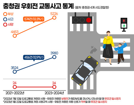 [충청투데이 김중곤 기자] 교차로 우회전 시 일지정지 의무를 법으로 규정했는데도 관련 교통사고는 오히려 증가한 것으로 나타났다.29일 충청권 4개 시·도경찰청에 따르면 관내 우회전 교통사고는 △2021년 1720건 △이듬해 1815건 △2023년 1904건 △지난해 2076건 등 매년 증가하고 있다.특히 사고건수를 우회전 관련 도로교통법 개정 전후 2년씩으로 묶어 비교하면 2020~2021년 3524건에서 2023~2024년 3980건으로 13% 늘었다.이 기간 충청권 모든 시·도에서 우회전 교통사고가 많아졌으며, 세종은 142건에