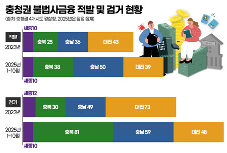 [충청투데이 김중곤 기자] 터무니없는 고율의 이자로 서민을 울리는 불법사금융이 몸집을 키우고 있어 더욱 주의가 요구된다.11일 충청권 4개 시·도경찰청에 따르면 올해 1~10월 관내 불법사금융 적발건수와 검거인원은 각각 137건에 198명으로 잠정 집계됐다.지역별로 △대전 39건 48명 △세종 12건 10명 △충남 59건 50명 △충북 38건 81명 등이다.특히 이는 지난해 전체 동안의 충청권 불법사금융 검거 규모(136건, 193명)를 뛰어넘은 수치다. 2023년(114건, 164명)과 비교하면 약 17% 늘었다.아직 2개월이 남