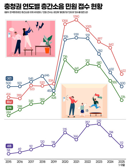 [충청투데이 김중곤 기자] 층간소음을 호소하는 충청권 지역민이 끊이지 않고 있지만, 정작 전문기관에서 측정한 소음 결과는 대부분 기준 미달인 것으로 나타났다.층간소음은 돌이킬 수 없는 살인 충동으로까지 이어지는 심각한 사회 문제로, 전문가들은 서로 배려하는 이웃 문화 조성이 무엇보다 중요하다고 조언한다.18일 한국환경공단 층간소음 이웃사이센터에 따르면 2019년부터 올해 9월까지 약 7년간 층간소음 민원이 들어온 대전 공동주택 32곳에서 정밀 측정한 결과 기준치를 초과한 곳이 하나도 없었다.분석 기간을 2015년부터로 확대해도 14
