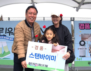 [충청투데이 강준식 기자] 8일 열린 ‘2025 클린워킹 페스티벌’ 참가자들의 관심이 집중된 경품 추첨 행사에서 단연 화제였던 1등 상품 ‘LG스탠바이미’는 청주시 청원구 오창읍에서 온 이지영(41) 씨에게 돌아갔다.이 씨는 딸 심채은(8) 양과 함께 단상에 올라 여명구 충청투데이 사장과 기념촬영을 하며 함박웃음을 지었다.이 씨는 "딸이 다니는 양청초등학교에서 행사가 있다고 알려줘 참여하게 됐다"며 "아이와 함께 걸으면서 쓰레기를 줍다 보니 뜻 깊은 체험 교육인 것을 깨닫게 됐다"고 했다.주말 아침이어서 오기 귀찮았다는 그는 "딸이