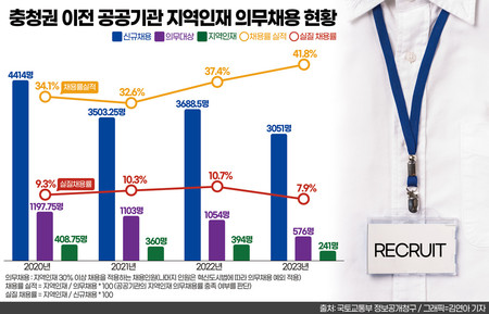 [충청투데이 김중곤 기자] 지방 이전 공공기관의 지역인재 의무채용제도에도 불구하고 충청권 대학생의 지역 공공기관 채용 문턱이 개선되지 않고 있다.특히 지난해부턴 정부의 공공기관 인력 감축 기조에 따라 기관이 채용 자체를 줄이면서 충청권의 지역인재 의무채용도 3년 전보다 2배 가까이 토막 났다.본보는 국토교통부로부터 ‘이전 공공기관의 연차별 지역인재 의무채용 실적’ 자료를 정보공개청구해 분석했다.혁신도시 조성 및 발전에 관한 특별법(혁신도시법)에 따라 2018년부터 지역인재 의무채용제도가 도입됐다.수도권에서 비수도권으로 이전한 전국