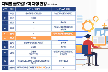 [충청투데이 김중곤 기자] =5년간 국비 1000억원을 지원받는 글로컬대학30 사업에 충남 건양대와 대전보건대가 본지정됐다. 평가 막판까지 잡음이 끊이지 않았던 충남대와 한밭대의 통합 모델은 지난해에 이어 또 한 번 탈락의 수모를 겪었다.김종수 글로컬대학위원장은 28일 오전 11시 정부 서울청사에서 이같은 내용의 ‘2024년 글로컬대학 본지정 평가 결과’를 발표했다.이날 교육부는 미래 한국 고등교육을 이끌 글로컬대학으로 10개 모델 17개 대학을 본지정했다.본지정 결과 충청권에선 건양대가 단독