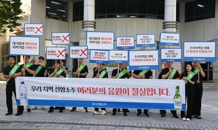 [충청투데이 박현석 기자] 51년간 지역민과 함께하는 ㈜선양소주 임직원들이 퇴근길, 거리로 나섰다.최근 겪고 있는 경영위기를 극복하고자 대시민 호소 길거리 홍보에 나선 것이다.28일 ㈜선양소주 임직원들은 대전시내 주요 교차로에서 시민들을 대상으로 ‘지역소주 사랑 캠페인’을 진행했다.최근 극심한 경영위기에 봉착한 현실을 지역 소비자들에게 호소하기 위해서다.㈜선양소주는 과거 지역민들의 사랑으로 지역소주시장 내 60% 이상의 점유율을 보여왔다.하지만 코로나19 팬데믹 이후 회식문화가 간소화되면서 주류 소비가 감소했고, 국내 대기업 소주회