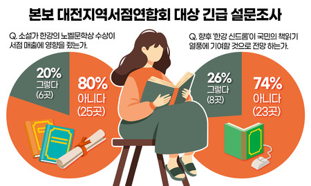[충청투데이 최윤서 기자] 지역서점의 위기가 한강 작가의 노벨상 수상이 불러일으킨 이른바 ‘한강 신드롬’에서도 고스란히 드러나고 있다.특히 향토서점 하나 없는 대전지역 서점업계엔 때 아닌 특수의 즐거운 비명 대신 곡소리가 울려 퍼지고 있다.최근 한강 작가가 노벨문학상을 탄 이후, 전국에 ‘한강앓이’가 계속되고 있다.실제 예스24, 교보문고, 알라딘 등 3대 대형서점에서만 한강의 책은 80만부가 넘게 팔렸다.그렇다면 과연 지역서점들도 같은 상황일까.14~15일 이틀에 걸쳐 본보는 대전지역서점연합회 소속 31곳을 대상으로 한강의 노벨문