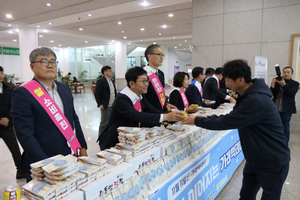 [충청투데이 조선교 기자] 농협중앙회 대전지역본부는 11일 대전시청에서 우리 쌀로 만든 가래떡을 나눠주며 가래떡데이 홍보 캠페인을 진행했다고 밝혔다.농협은 11월 11일 농업인의 날을 기념하고, 우리 쌀 소비를 장려하기 위해 2006년부터 가래떡데이을 지정해 운영하고 있다.특히 이번 캠페인은 농업인의 긍지와 자부심을 고취시키고 농업의 중요성을 되새기고자 마련됐으며 김영훈 본부장을 비롯해 황진선 NH농협은행 본부장, 유득원 대전시 행정부시장, 박영철 녹지농생명국장, 임성복 농생명정책과장 등이 참여했다.캠페인에선 대전시민과 출근길 시민
