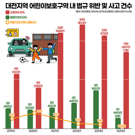 [충청투데이 함성곤 기자] 최근 5년 대전 어린이보호구역 내 과속·신호위반, 불법주정차 등 법규 위반 건수가 100만건이 넘으면서 어린이 교통안전 인식 저하에 대한 지적이 이어진다.스쿨존 내 아동 교통사고는 감소 추세에 들었으나 교통법규 위반 행위는 되려 늘어 사고 위험이 여전히 잠재돼 있는 것이다.1일 대전경찰청과 대전시에 따르면 2019년부터 지난해까지 스쿨존 내 과속과 신호위반, 불법주정차 단속 건수는 모두 105만 5708건으로 나타났다.연도별 스쿨존 내 불법주정차 단속 건수는 △2019년 2만 3995건 △2020년 2만