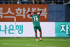 [충청투데이 이재범 기자] 충남아산FC 공격수 데니손이 시즌 최종전에서 득점을 터트리며 홈팬들에게 승점 3점을 선물했다.데니손은 23일 오후 이순신종합운동장에서 치러진 ‘하나은행 K리그2 2025’ 39라운드 전남드래곤즈와의 경기 후반 22분에 투입됐다.그는 경기장에 들어간 이후 내내 좋은 모습을 보였으나 좀처럼 득점 찬스는 오지 않았다. 그러다 데니손은 후반 추가시간 6분 자신이 얻어낸 페널티킥 찬스에 키커로 나서 팀의 결승골을 성공시켰다.데니손의 득점에 힘입어 아산은 전남을 2대 1로 꺾었다. 올시즌 전남과의 상대 전적에서도 1