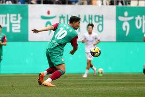 [충청투데이 서유빈 기자] 대전하나시티즌이 사상 첫 파이널A에 진출해 치른 첫 경기에서 승리하면서 홈 5연승을 질주하고 있다.앞으로 남은 4경기도 전력을 다해 아시아축구연맹(AFC) 챔피언스리그 엘리트(ACLE) 진출까지 노려야 한다.대전하나는 26일 오후 4시30분 대전월드컵경기장에서 열린 ‘하나은행 K리그1 2025 34라운드(파이널A 1라운드)’에서 포항스틸러스를 2-0으로 꺾었다.전반 26분 주민규가 따낸 프리킥을 이명재가 왼발 슈팅으로 선제골에 성공했고 전반 44분에는 마사가 유도한 페널티킥으로 주민규의 추가골까지 나왔다.