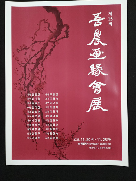 [충청투데이 김지현 기자] 대전 오원화랑은 20일부터 6일 동안 제15회 오농화연회전을 진행한다고 17일 밝혔다.오농화연회전은 오원화랑 대표인 오농 김진원 선생과 그 문하생들의 문인화 작품을 선보이는 전시다.김 대표는 대한민국 화관문화훈장을 수훈하고 대전서구문화원 원장을 역임하는 등 지역 문화예술계를 이끌어온 인물이다.오농화연회는 2011년 창립전 이후 매년 꾸준히 전시를 진행해오고 있다.이번 오농화연회에는 김 대표를 비롯해 지역에서 활발하게 활동하는 작가 22명이 참여한다.참여 작가 대부분은 대전시미술대전·대한민국미술대전 초대작가