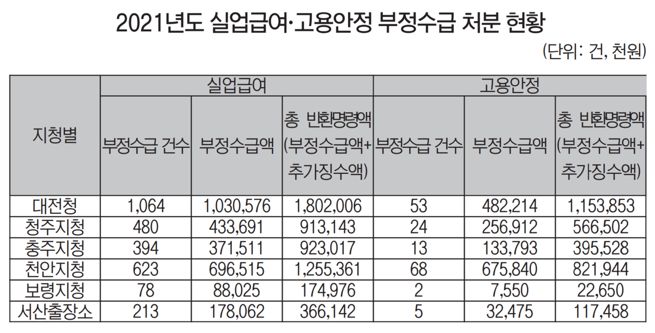 지난해 충청권 고용보험 부정수급으로 인한 반환명령액이 85억원에 육박하는 등 코로나19(이하 코로나) 사태 이후 수요가 늘어난 실업급여·고용장려금 악용 사례가 빈번히 일어나고 있다.