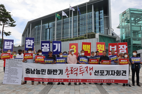 전국농민회총연맹 충남도연맹(이하 충남도연맹)은 15일 충남도청 앞에서 기자회견을 열고 "면세유는 작년 6월 대비 2배 이상 오르고 인건비도 15만원으로 치솟는 등 농자재·농업경영비용은 폭등하고 있는데 쌀값은 13만원으로 폭락하면서 수확기 후에 대출이자 갚기도 막막하다"며 "밥 한 공기에 농민에게 돌아오는 비용이 206원인데, 지금처럼 쌀값이 폭락하는 상황에서 경영비용을 정산하면 얼마가 남을지도 몰라 이번 겨울을 나기가 두렵다"라고 호소했다.