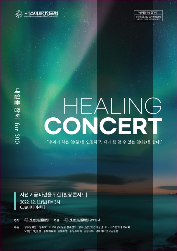 8일 스마트경영포럼에 따르면 포럼은 오는 11일 오후 3시 CJB미디어센터에서 자선기금 마련을 위한 힐링콘서트를 연다.