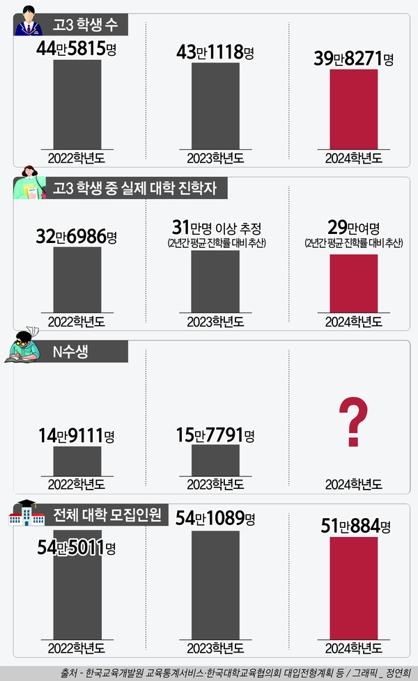 최근 2년간 고3 학생의 진학률이 73%대인 점을 고려하면 2024학년도 대입에서는 고3 학생 중 29만여명이 실제 진학할 것으로 추산된다.