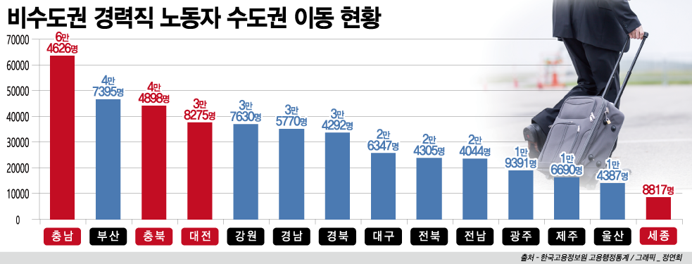 수도권에서 수도권으로 이직한 경우를 제외하면 전국 14개 시·도 중 충남(6만 4626명) 경력직 근로자의 수도권 이직이 가장 많은 상황. 충북(4만 4898명)과 대전(3만 8275명)도 수도권 이직이 잦은 상위 도시에 이름을 올렸다.