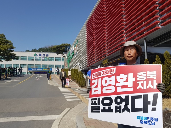 김 지사의 괴산군청 도착 1시간 전부터 군청 앞에서 괴산광복회 회원 등 주민들이 김 지사와 윤석열 대통령을 싸잡아 비난하는 글이 쓰인 피켓을 들고 시위를 했다.