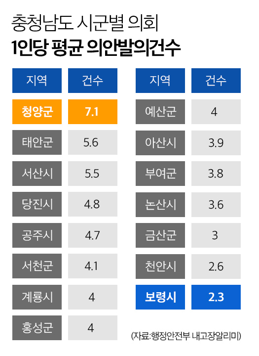 5일 내고장알리미에 등록된 자료를 보면 이 기간 충남 15개 시·군의회 의원 171명이 발의한 조례안은 685건으로, 한 명당 평균 4건이다. 기초의회별로 보면 청양군의회가 의원 7명이 50개 조례안을 발의해 1인당 의안 발의건수가 7.1개로 가장 많았다.