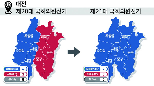 앞선 21대 총선에서 대전지역 지역구 7곳을 모두 차지했던 민주당은 현역 의원을 중심으로 텃밭다지기에 주력하는 반면 도전자 입장이 된 국민의힘은 현역 의원에 맞설 총선 주자 라인업에 심혈을 기울 것으로 보인다.