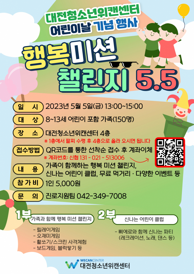 [충청투데이 최윤서 기자] 대전청소년위캔센터는 어린이날을 맞아 내달 5일 체험행사를 진행한다.