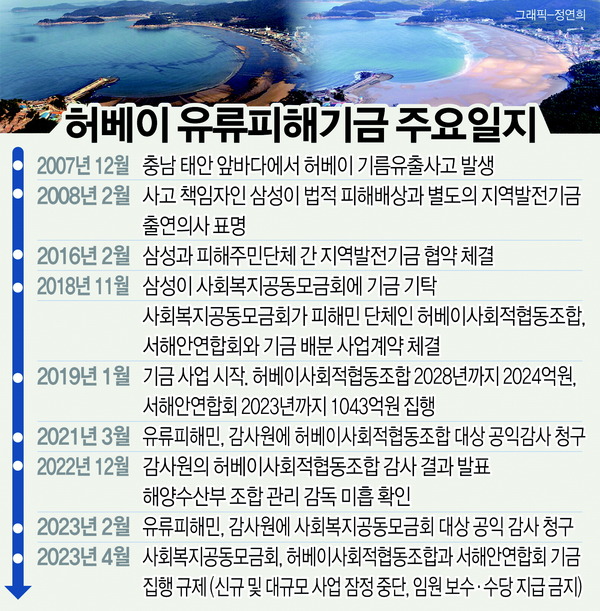 2018년 11월 피해민단체인 허베이사회적협동조합(이하 조합)과 서해안연합회(이하 연합회)가 모금회와 배분사업 계약을 체결해 각각 2024억원과 1043억원을 받았다. 그런데 조합은 사업기간이 2028년까지인데 2019~2021년 전체 기금의 7.8%만 사용했고, 올해 사업이 끝나는 연합회는 현재까지 이자만 사용해 원금이 그대로 남아 있다. 저조한 기금 집행은 단체가 내부 갈등 등을 이유로 정상 운영되지 않았고, 결국 모금회는 지난달 20일부로 조합과 연합회 자금 사용을 규제하는 고강도 조치를 내렸다.