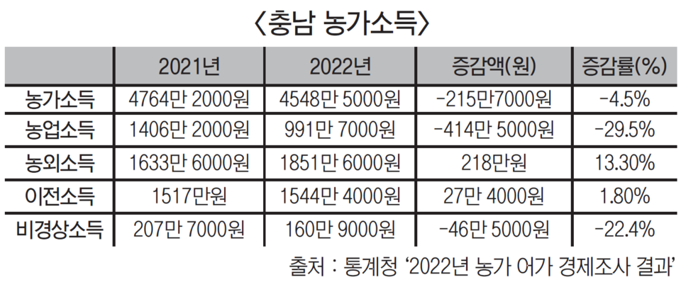 최근 통계청이 발표한 ‘2022년 농가 및 어가 경제조사 결과’를 보면, 지난해 충남 농가소득은 4548만 5000원으로 전년보다 215만 7000(4.5%)원 하락했다.