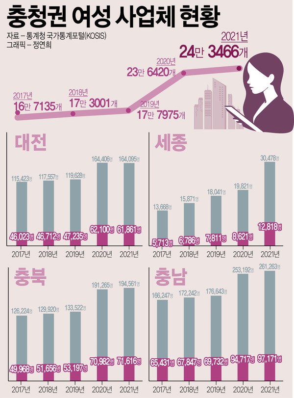 지난 5년간 충청권 여성 사업체는 전반적으로 몸집을 키워왔다. 2017년 16만 7135개→2018년 17만 3001개→2019년 17만 7975개→2020년 23만 6420개→2021년 24만 3466개로 급증했다.