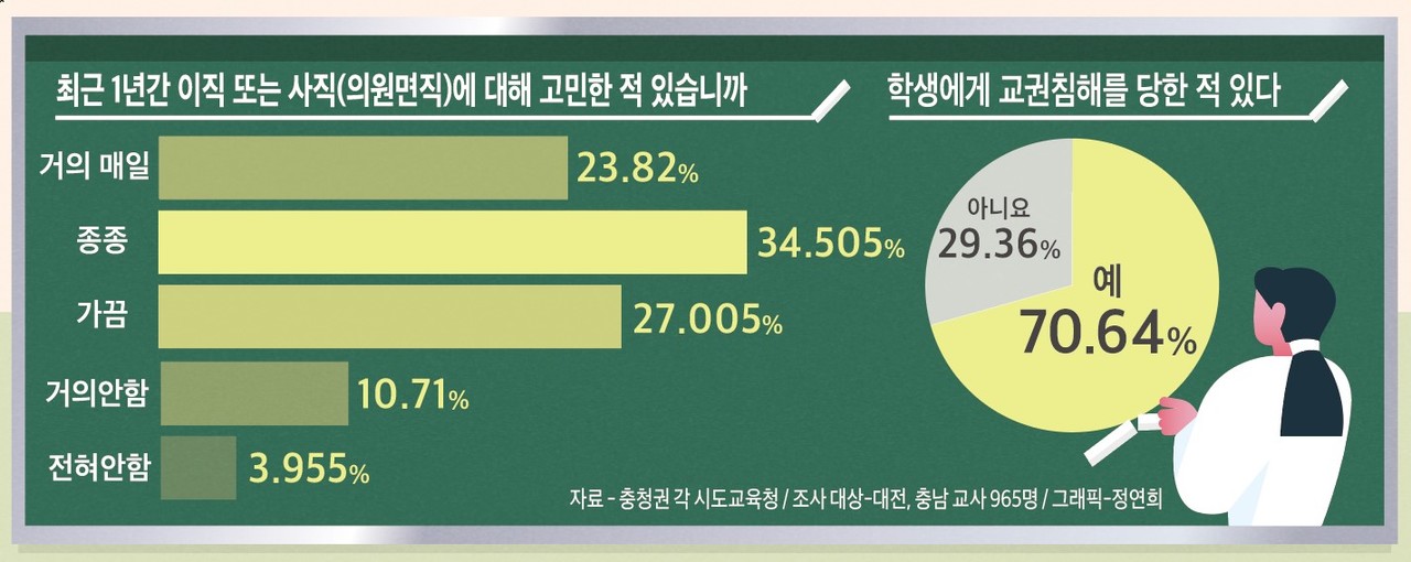 지난 5월 스승의 날을 맞아 교사노조가 대전·충남지역 교사 965명을 설문한 결과 평균 70.64%가 교권침해 경험이 있다고 답한 바 있다. 또 응답자 중 절반이 넘는 58.32%가 ‘거의 매일’이나 ‘종종’ 이직이나 사직을 고려한다고 응답했다.