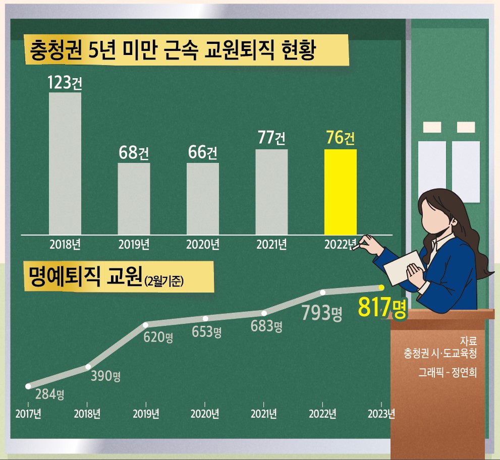 올해 충청권 명예퇴직 교원은 6년 만에 3배가 증가했고, 임용 5년 미만의 저 연차 교사는 5년간 410명이 사직서를 제출했다.
