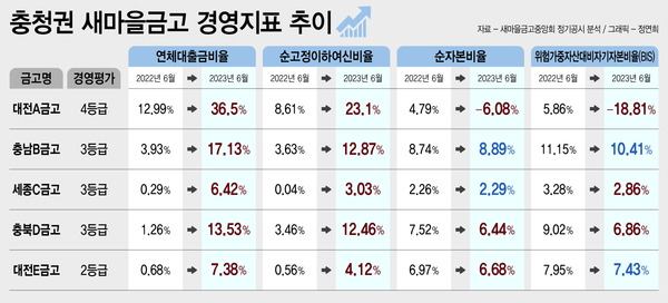세종 C금고와 충북 D금고도 연체율이 각각 6.42%, 13.53%로 전년 대비 크게 늘었다. 최근 동일인에게 수백억 대출을 무분별하게 내주며 전세사기 피해자를 양산한단 의혹이 제기된 대전 E금고의 경우 연체율은 0.68%→7.38%, 고정이하여신비율이 0.56%→4.12%로 1년 새 경영지표가 악화됐다. 한편 올해 6월 말 기준 새마을금고 내부 경영평가에서 3~4등급을 받은 충청권 금고는 모두 24곳이다.