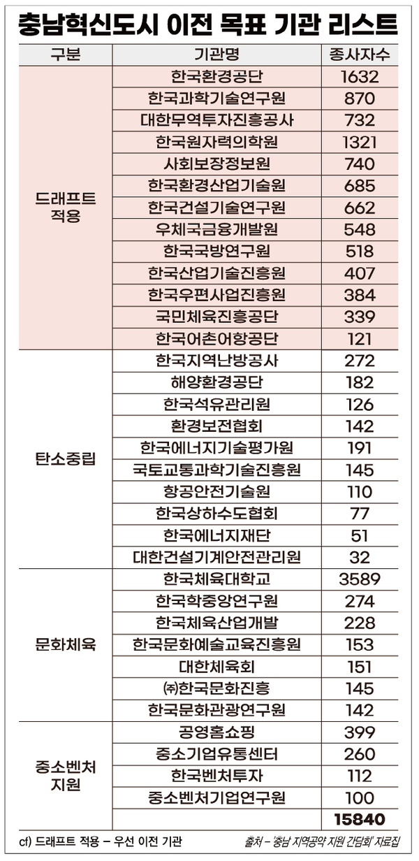 당시 도는 이미 한 차례 공공기관을 이전받은 1기 혁신도시와 형평성을 고려할 때 대형기관(100명 이상) 13곳, 탄소중립 기능군 10곳, 문화·체육 기능군 7곳, 중소·벤처지원 기능군 4곳이 충남에 내려와야 한다며 구체적인 기관명을 밝혔다.