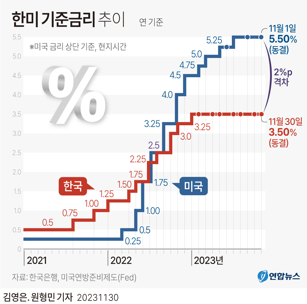 이날 한은 금통위가 기준금리를 동결하며 미국(5.25∼5.50%)과의 기준금리 역전 폭은 2%p로 유지됐다.