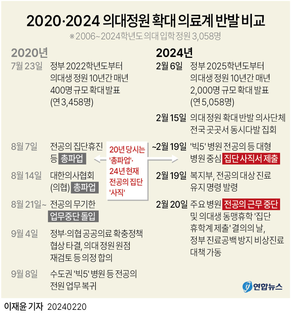 '파업'했던 2020년과 달리, 이번에는 '사직'인 만큼 상황이 더 악화할 수도 있다는 우려도 의료계 안팎에서 확산하고 있다.