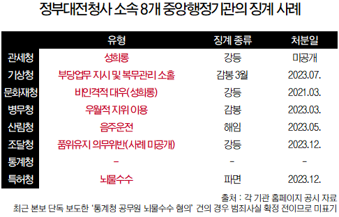 21일 정부대전청사 소속 8개 중앙행정기관이 매년 공시하는 공직자 징계 현황을 종합해보면 최근 5년간 부패·비위 행위로 경·중징계 처분을 받은 공무원은 모두 150명으로 조사됐다.