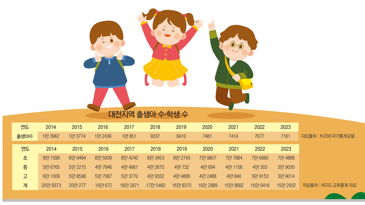 대전지역 초·중·고 학생수는 2014년은 20만 9373명이었으나 2023년은 15만 2932명으로 줄어들어 2014년 대비 5만 6441명(26.9%)이나 빠졌다.