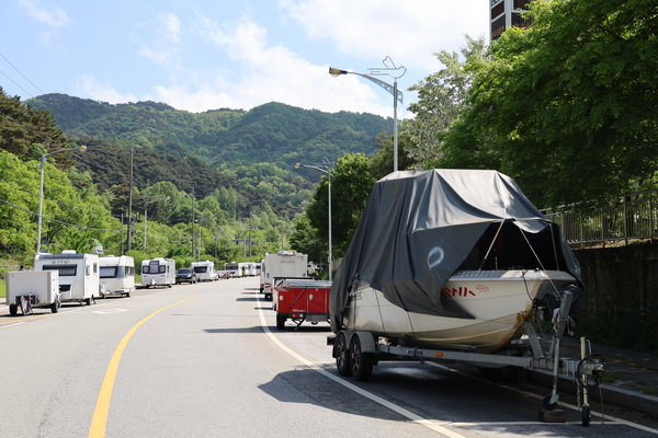 충청투데이는 이날 오전 청주랜드 주변 공영 노상주차장을 찾았다. 청주랜드에서 명암약수터 버스정류장까지 약 1㎞ 거리에 50대 가량의 캠핑카와 카라반 등이 주차돼 있었다. 일부 구간은 캠핑카와 카라반 등이 점령하고 있어 흡사 전용주차장을 방불케 했다. 또 레저보트와 제트스키를 주차해 놓은 모습도 눈에 띄였다.
