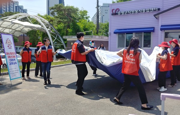 23일 증평군자원봉사종합센터 교육장에 모인 재난 담당자 40여명은 여름철 장마 등 재난 발생 시 피해 복구 자원봉사 활동현장에서 신속히 이재민을 지원할 수 있도록 에어텐트, 고압세척기 등 재난 장비를 실제로 운용하며 사용법을 익혔다.