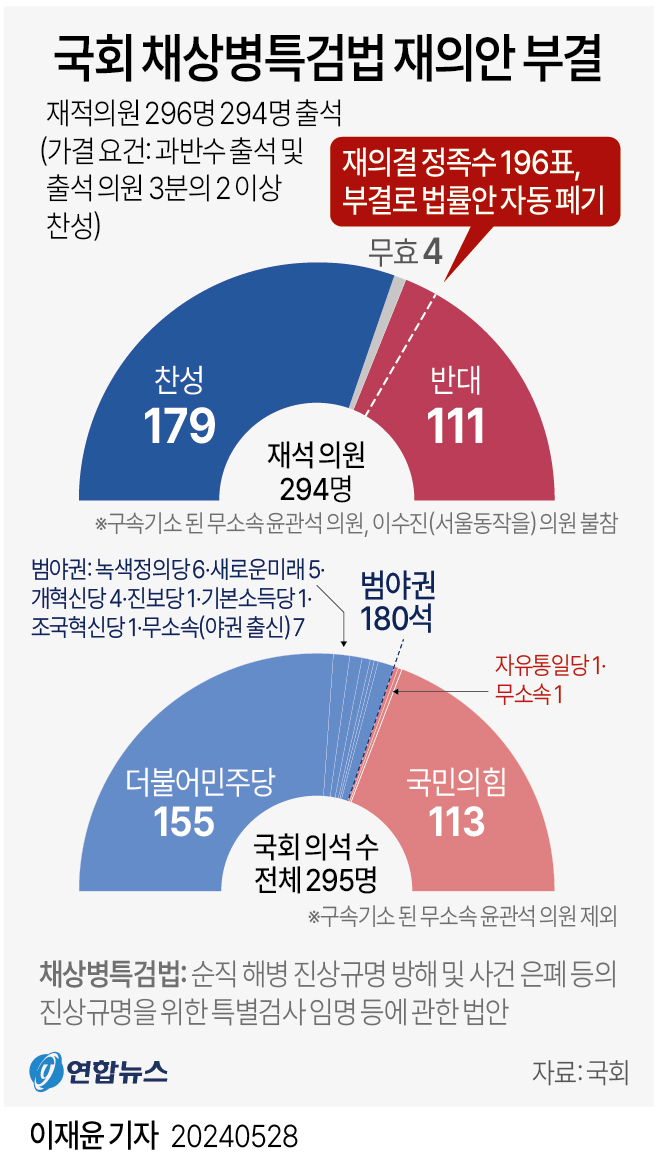 야당 단독으로 본회의를 통과한 채상병특검법은 재적의원 과반수 출석과 출석의원 3분의 2 이상 찬성이 필요했지만 결국 의결 조건을 충족하지 못하고 폐기됐다.