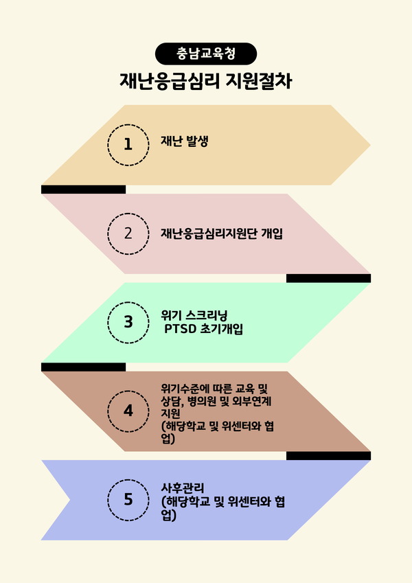 충남교육청(김지철)은 지난해 재난사고(사고, 화재, 지진, 산불 등) 발생 시 위기 학생에 대한 통합심리지원 체계를 구축하기 위해 재난응급심리지원단(이하 재난응급심리지원단)을 발족했다.