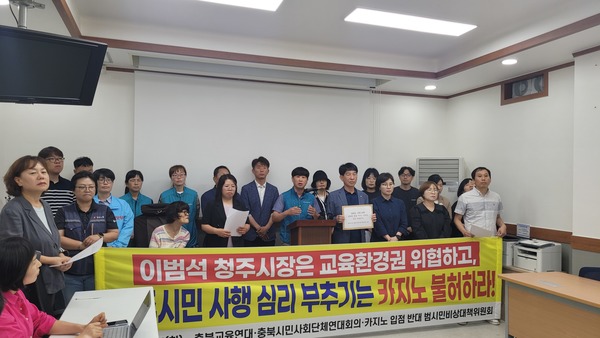 끝으로 이들은 "문화체육관광부에서 업체 이전을 허가받은 카지노 업체가 청주시에 관광사업 계획 변경서를 접수해 결정만 남겨 놓고 있다"며 "청주시는 카지노 입점을 불허하고 현행법 허점을 핑계로 허용한다면 직무유기며 책임을 반드시 져야 한다"고 말했다.