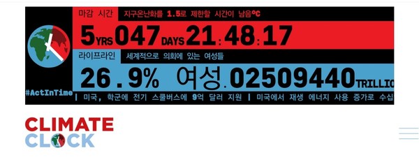기후위기 시계: 기후위기 시계는 지구 평균기온이 산업화 이전보다 1.5℃ 상승하는 시점까지 남은 시간을 표시하는 디지털 시계이다. 이 시계는 전 세계 과학자와 기후 활동가들이 고안한 프로젝트로, 기후변화의 심각성을 시각적으로 보여준다.