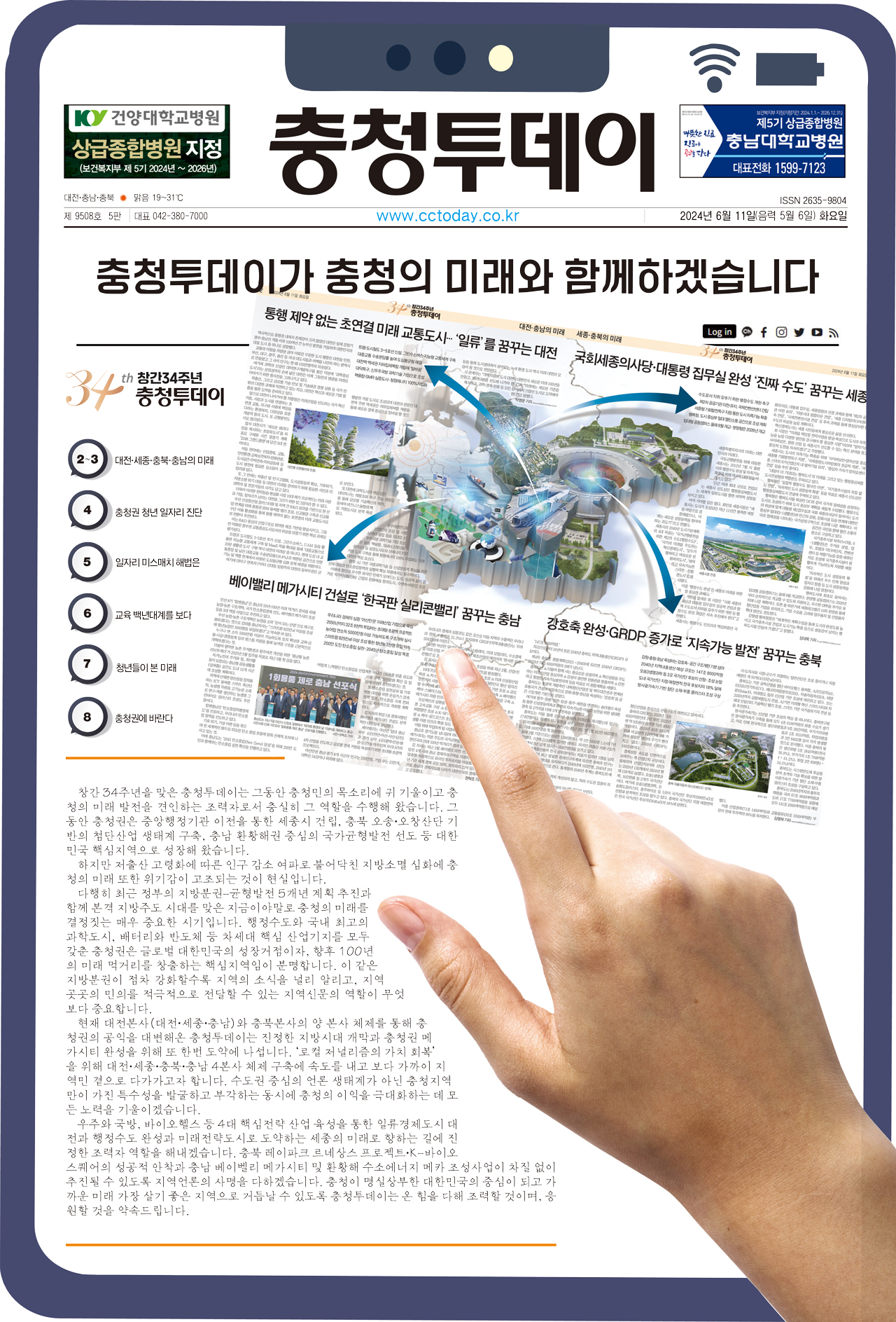 창간 34주년을 맞은 충청투데이는 그동안 충청민의 목소리에 귀 기울이고 충청의 미래 발전을 견인하는 조력자로서 충실히 그 역할을 수행해 왔습니다. 그동안 충청권은 중앙행정기관 이전을 통한 세종시 건립, 충북 오송·오창산단 기반의 첨단산업 생태계 구축, 충남 환황해권 중심의 국가균형발전 선도 등 대한민국 핵심지역으로 성장해 왔습니다.