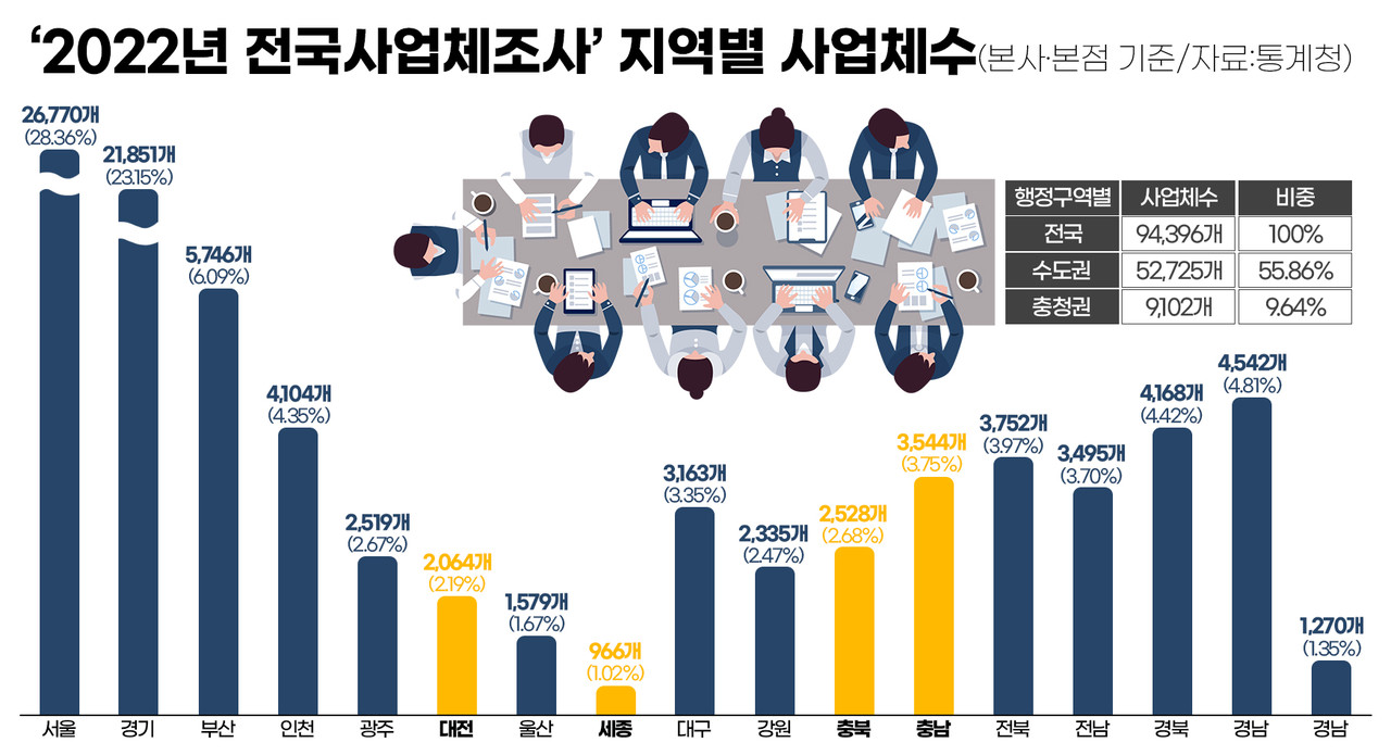 11일 ‘2022 전국사업체조사’ 통계에 따르면 우리나라 전체 사업체 613만 3899개 중 49.06%인 301만 2109개가 수도권(서울·경기·인천)에 쏠려 있는 것으로 나타났다.